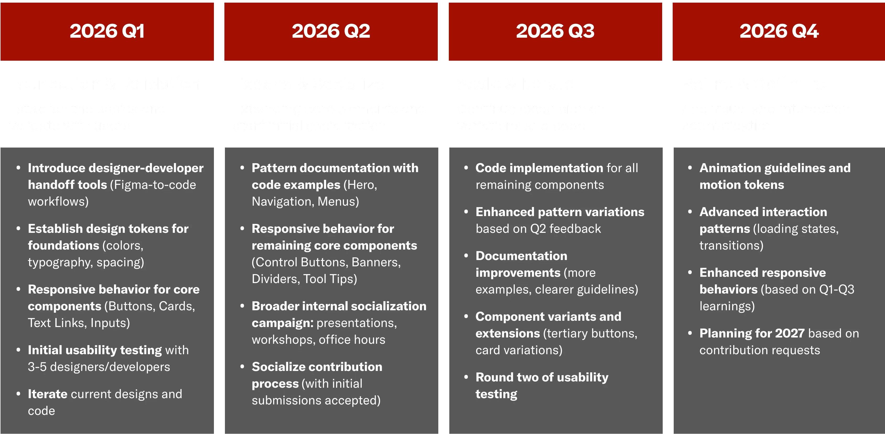 Q1 focuses on foundations: tokens, responsive components, and initial testing. Q2 is about expansion and getting teams on board. Q3 scales things up with advanced patterns and a second testing round. Q4 adds polish and plans for 2027.
